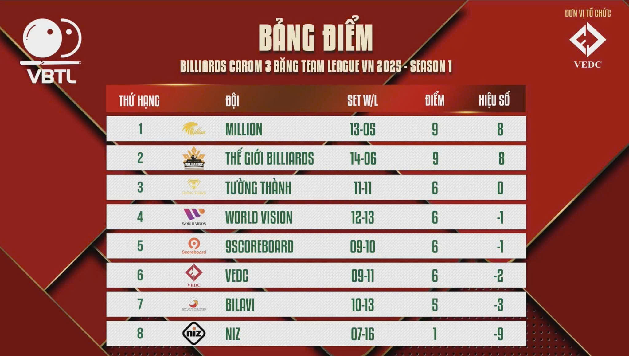 Đáng nói là dù để thua trước Team 9scoreboard, Team Million vẫn đang dẫn đầu bảng xếp hạng (BXH) khi ở lượt trận cuối ngày, đối thủ cạnh tranh trực tiếp của Thanh Tự và đồng đội là Team Thế Giới Billiards bất ngờ nhận thất bại trước Team Bilavi.