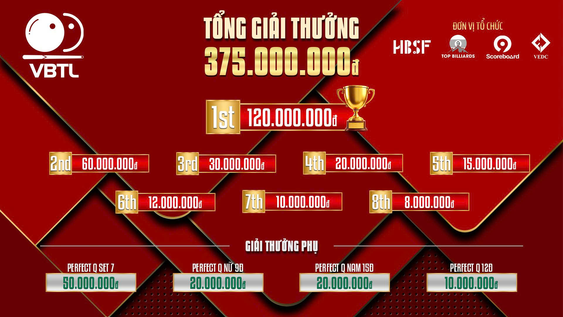 Giải Billiards Carom 3 băng Team League (VBTL) 2025 diễn ra từ ngày 25-31/12 này chứng kiến lần đầu tiên, carom 3 băng nước nhà có một giải đấu thi đấu theo thể thức Team League (Đấu Đội) độc đáo. Có 8 đội tranh tài, trong đó quy tụ những cơ thủ chuyên nghiệp, nữ và trẻ tốt nhất Việt Nam hiện nay tranh chấp tổng giải thưởng gần 400 triệu đồng. Trong đó, đội vô địch sẽ nhận về 120 triệu đồng. Song song đó, giải đấu còn có những giải phụ cực kỳ hấp dẫn như Perfect Q Set 7 (50 triệu đồng), Perfect Q nữ 9 điểm, (20 triệu đồng), Perfect Q nam 15 điểm (20 triệu đồng) và Perfect Q 12 điểm (10 triệu đồng).