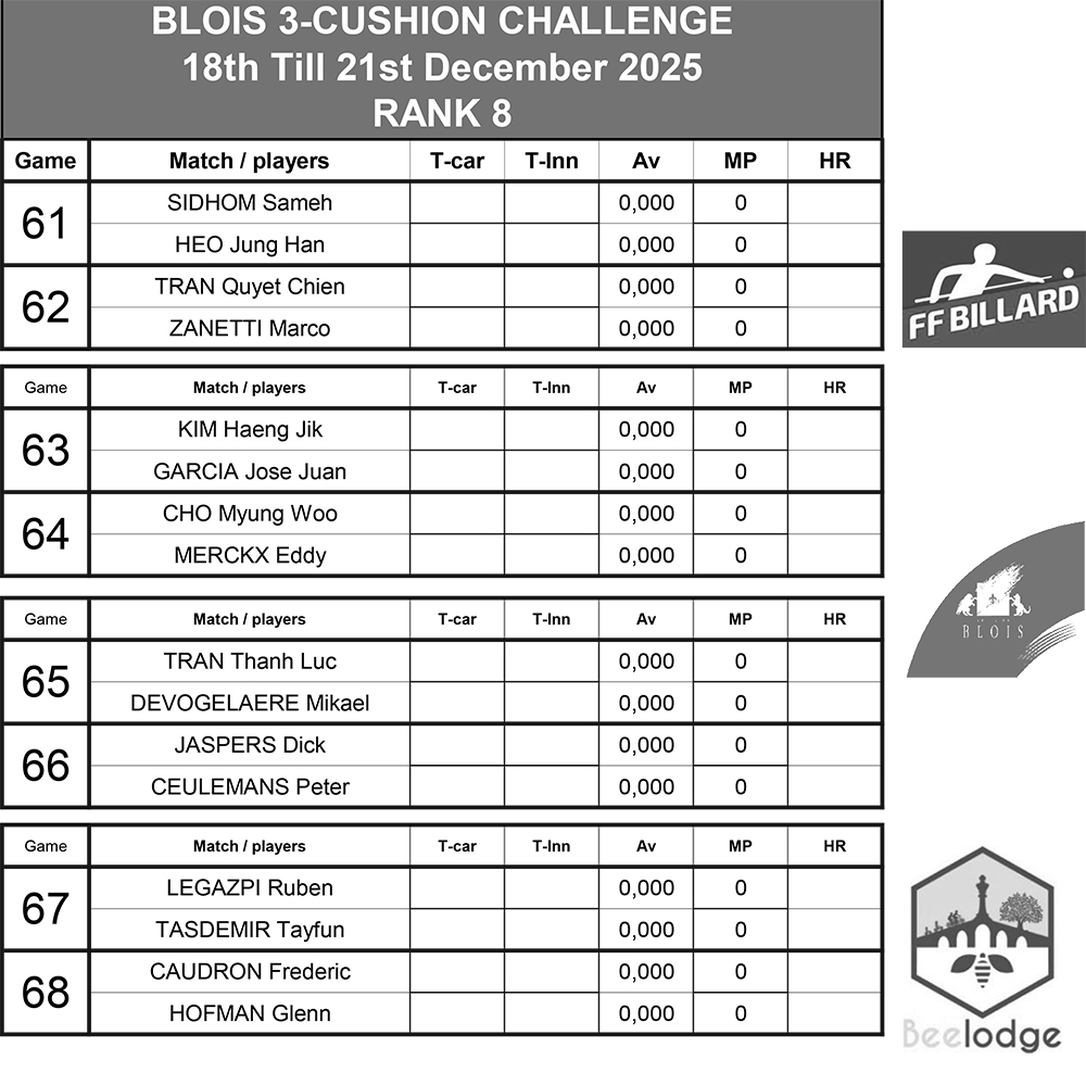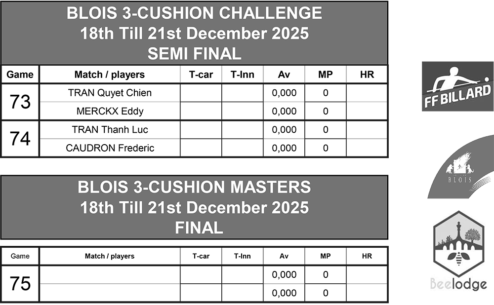 Lịch thi đấu, trực tiếp Billiards Blois 3C Challenge năm 2025 hôm nay. Cập nhật lịch trực tiếp giải Billiards Blois 3C Challenge năm 2025 mới nhất.