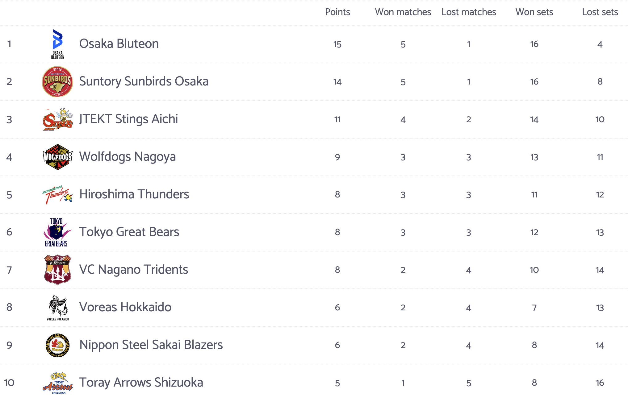 Cuộc đua vô địch tại giải bóng chuyền nam VĐQG Nhật Bản vẫn là thế song mã thường thấy giữa Osaka Bluteon và Suntory Sunbirds tiếp tục bám đuổi nhau quyết liệt trên đầu bảng xếp hạng. Sau 6 vòng đấu, cả hai đội đều sở hữu thành tích 5 thắng – 1 thua, tạo nên thế song mã hấp dẫn và khó lường.