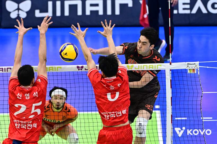 Với lợi thế sân nhà cùng màn trình diễn thuyết phục của các trụ cột, OK Savings Bank đã xuất sắc đánh bại Hyundai Capital với tỷ số 3-0 (25-20, 26-24, 25-18) trong khuôn khổ Jin Air V-League nam.