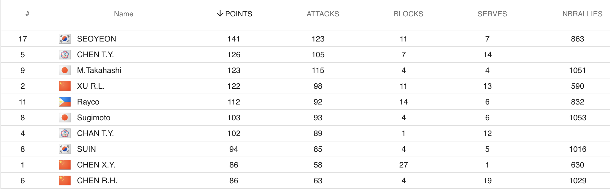 Đứng số 1 là Son Seoyeon – đội trưởng Hàn Quốc, người ghi tổng cộng 141 điểm với khả năng tấn công mạnh mẽ và ổn định, góp công lớn giúp đội nhà lần đầu tiên vô địch châu Á. Cùng đồng đội Jang Suin và Lee Dayeon, Hàn Quốc khẳng định sức mạnh vượt trội tại giải đấu.