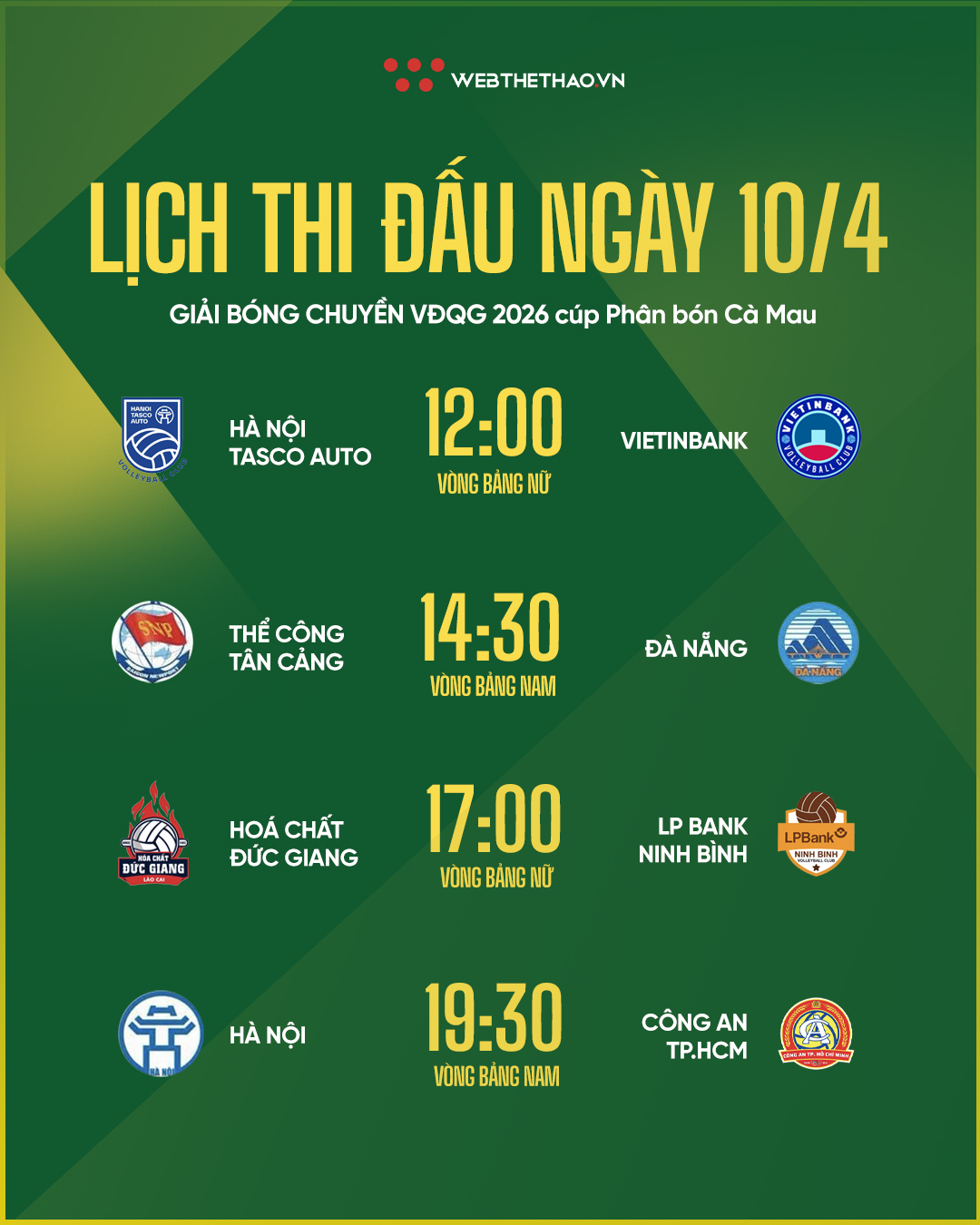 Với lịch thi đấu dày đặc cùng những cặp đấu cân tài cân sức, ngày 10/4 hứa hẹn sẽ mang đến bữa tiệc bóng chuyền mãn nhãn cho người hâm mộ.