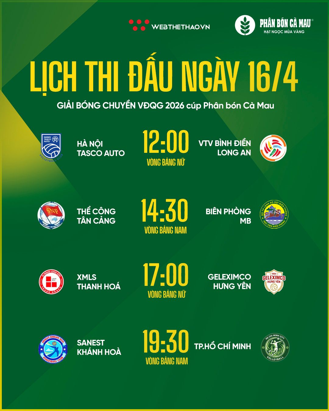 Cập nhật link trực tiếp giải bóng chuyền VĐQG 2026 hôm nay, trận đấu giữa Hà Nội Tasco Auto vs VTV Bình Điền Long An diễn ra lúc 12h00 ngày 16/4.