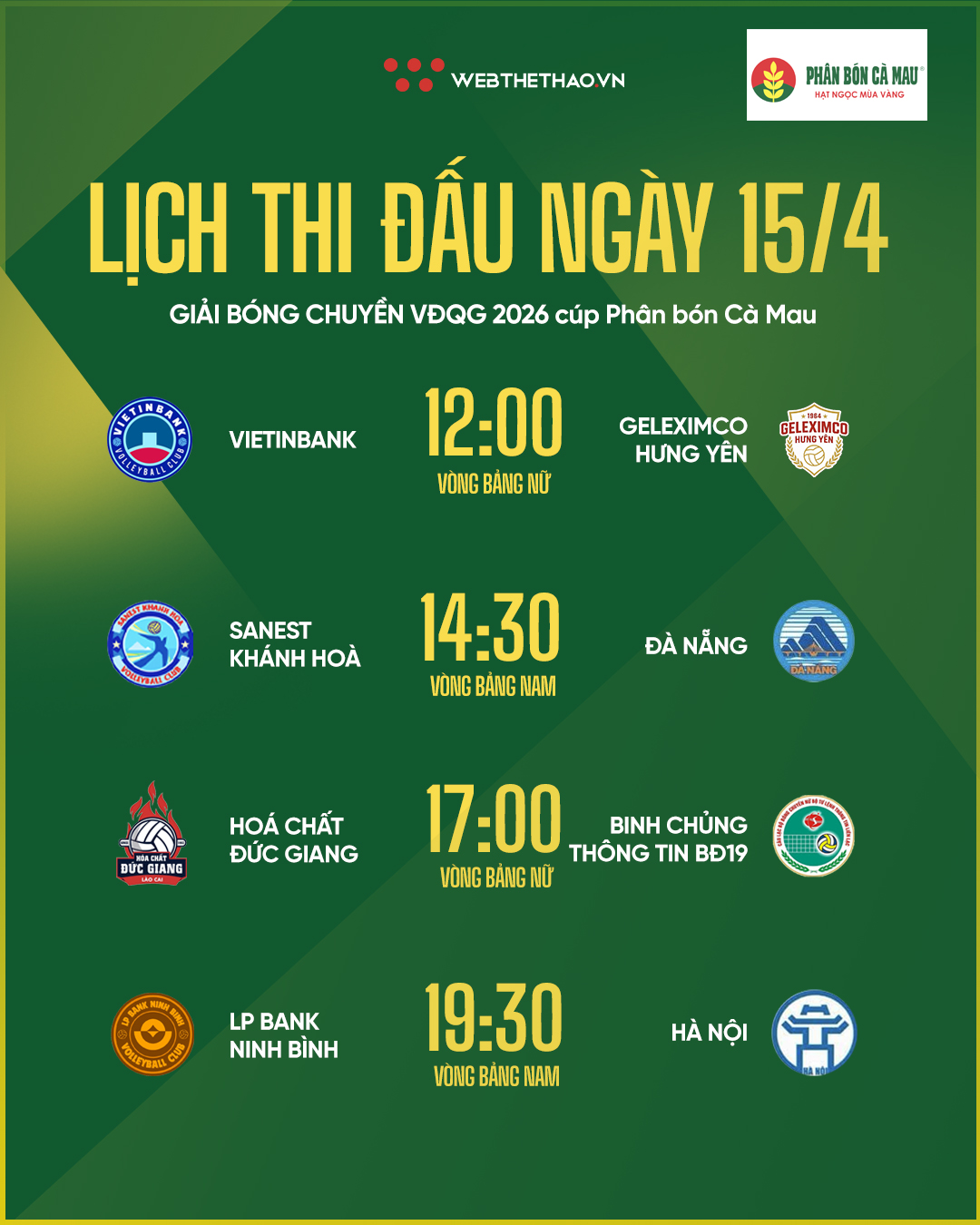 Cập nhật link trực tiếp giải bóng chuyền VĐQG 2026 hôm nay, trận đấu giữa Vietinbank vs Geleximco Hưng Yên diễn ra lúc 12h00 ngày 15/4.