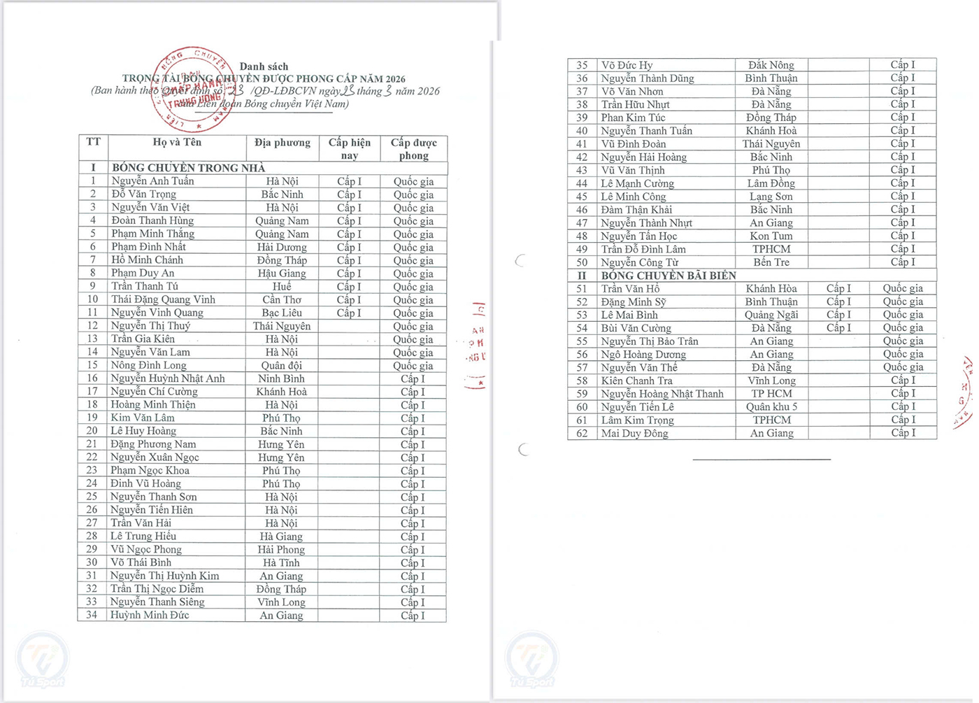 Liên đoàn bóng chuyền Việt Nam đã quyết định phong cấp cho 62 trọng tài bóng chuyền trong nhà và bãi biển.