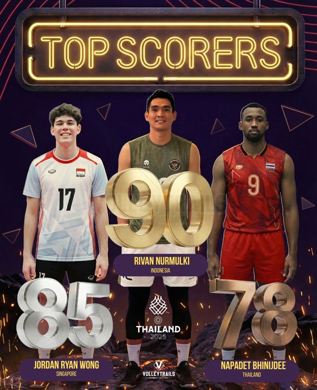 Xếp ngay sau là Wong J R của Singapore với 85 điểm sau 4 trận đấu. Tay đập trẻ này cho thấy sự tiến bộ rõ rệt, trở thành niềm hy vọng lớn nhất của bóng chuyền Singapore trong tương lai gần. Đứng thứ ba là Napadet của Thái Lan với 78 điểm sau 5 trận, tiếp tục đóng vai trò đầu tàu của đội chủ nhà.