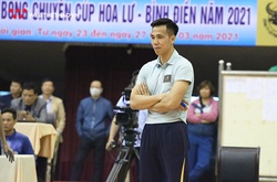 Ngồi trên khán đài dự khán các học trò thi đấu trong trận chung kết nội dung nam Cúp bóng chuyền Hoa Lư - Bình Điền 2021 là HLV đội tuyển bóng chuyền nam quốc gia Li Huan Ning.