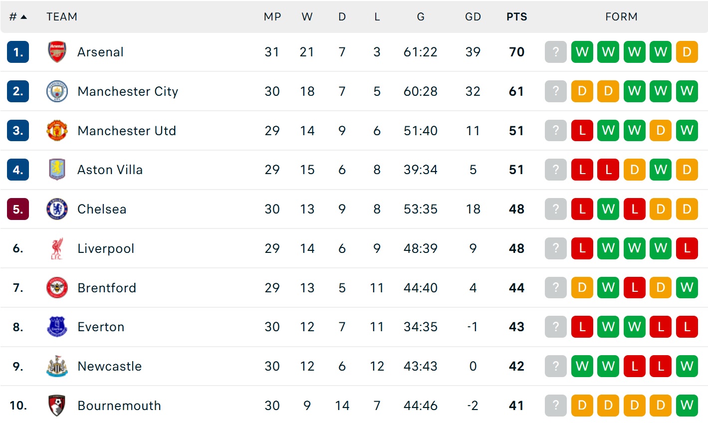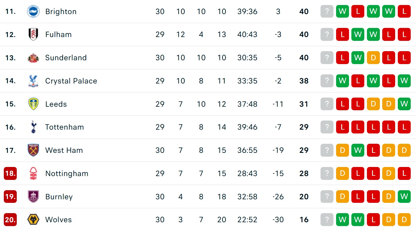 Bảng xếp hạng Ngoại hạng Anh mới nhất