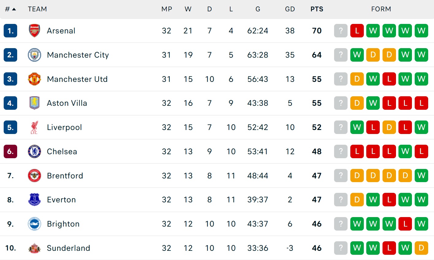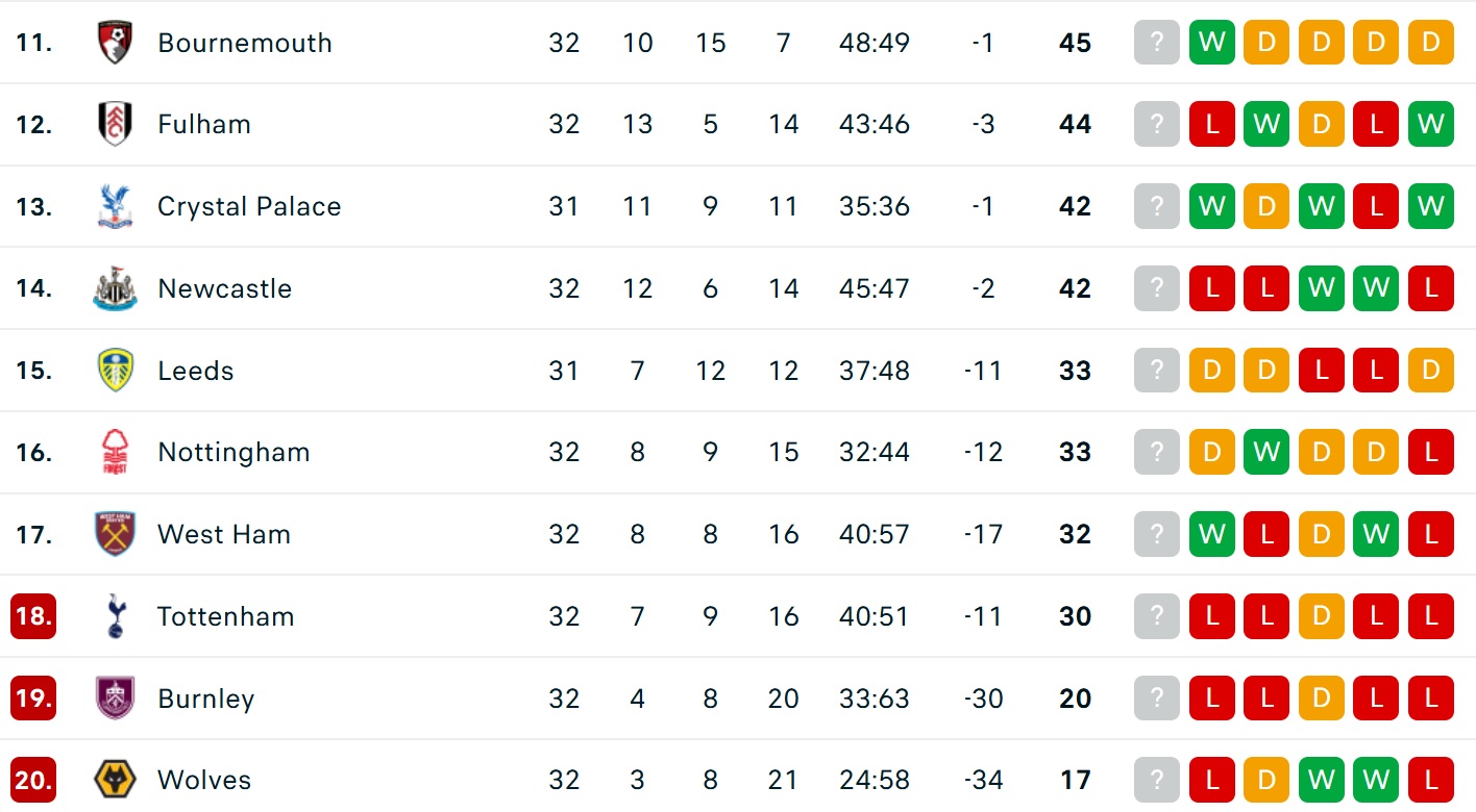 Ở cuộc đua giành suất dự Champions League, Chelsea tiếp tục thất thế với thất bại thứ ba liên tiếp (thua 4/5 vòng gần đây), kém đội xếp thứ năm tới 4 điểm.