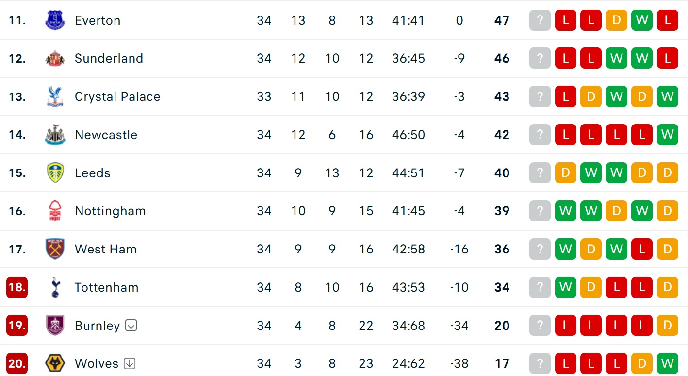 Bảng xếp hạng Ngoại hạng Anh mới nhất