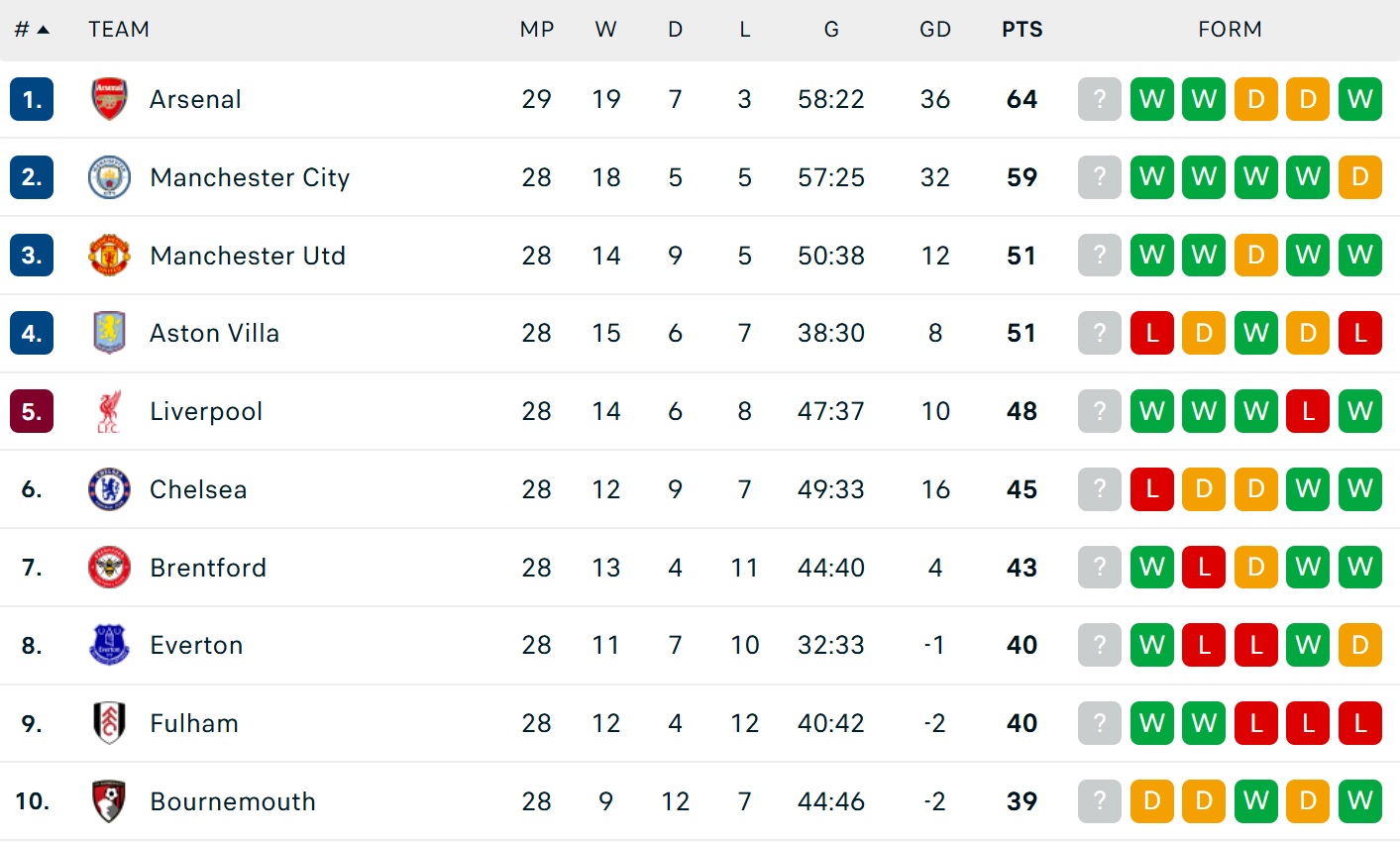 Chiến thắng này giúp Arsenal tái lập khoảng cách 5 điểm với Man City mặc dù họ đã chơi nhiều hơn một trận. Trong khi đó, Chelsea tụt xuống vị trí thứ 6, kém Liverpool xếp trên 3 điểm.
