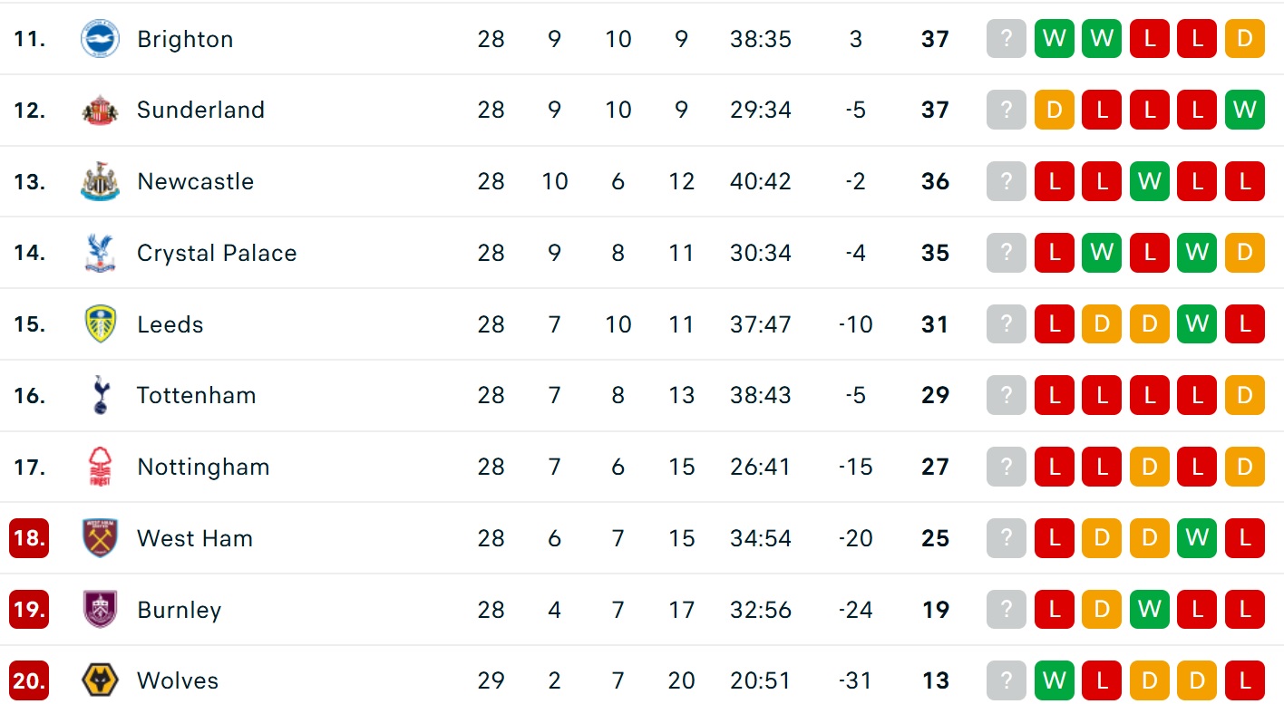 Bảng xếp hạng Ngoại hạng Anh mới nhất