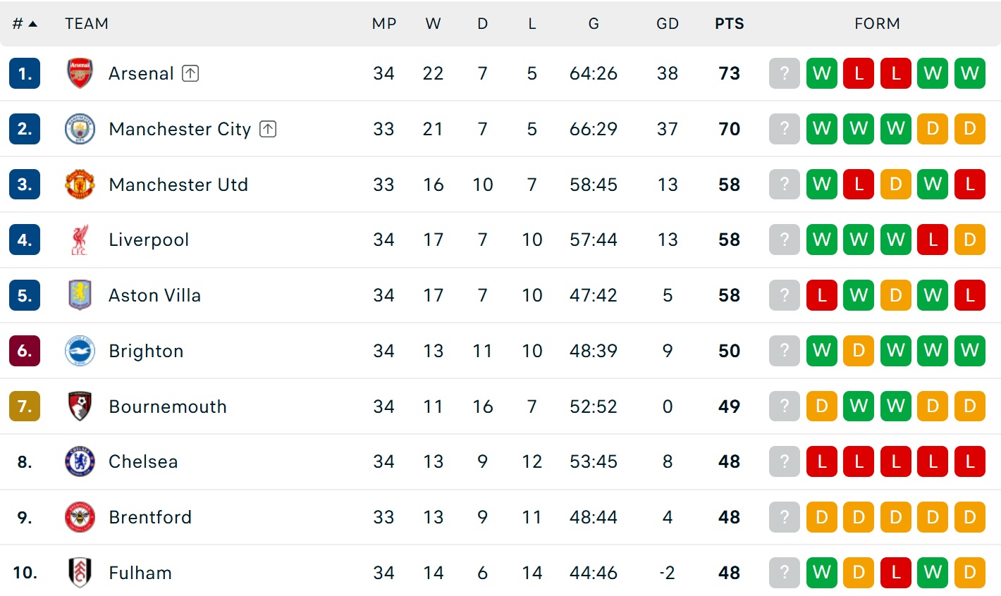 Đánh bại Newcastle với bàn thắng duy nhất của Eze, Arsenal đã trở lại ngôi đầu bảng với 73 điểm, hơn Man City 3 điểm, đội không thi đấu vòng này do tham dự FA Cup.