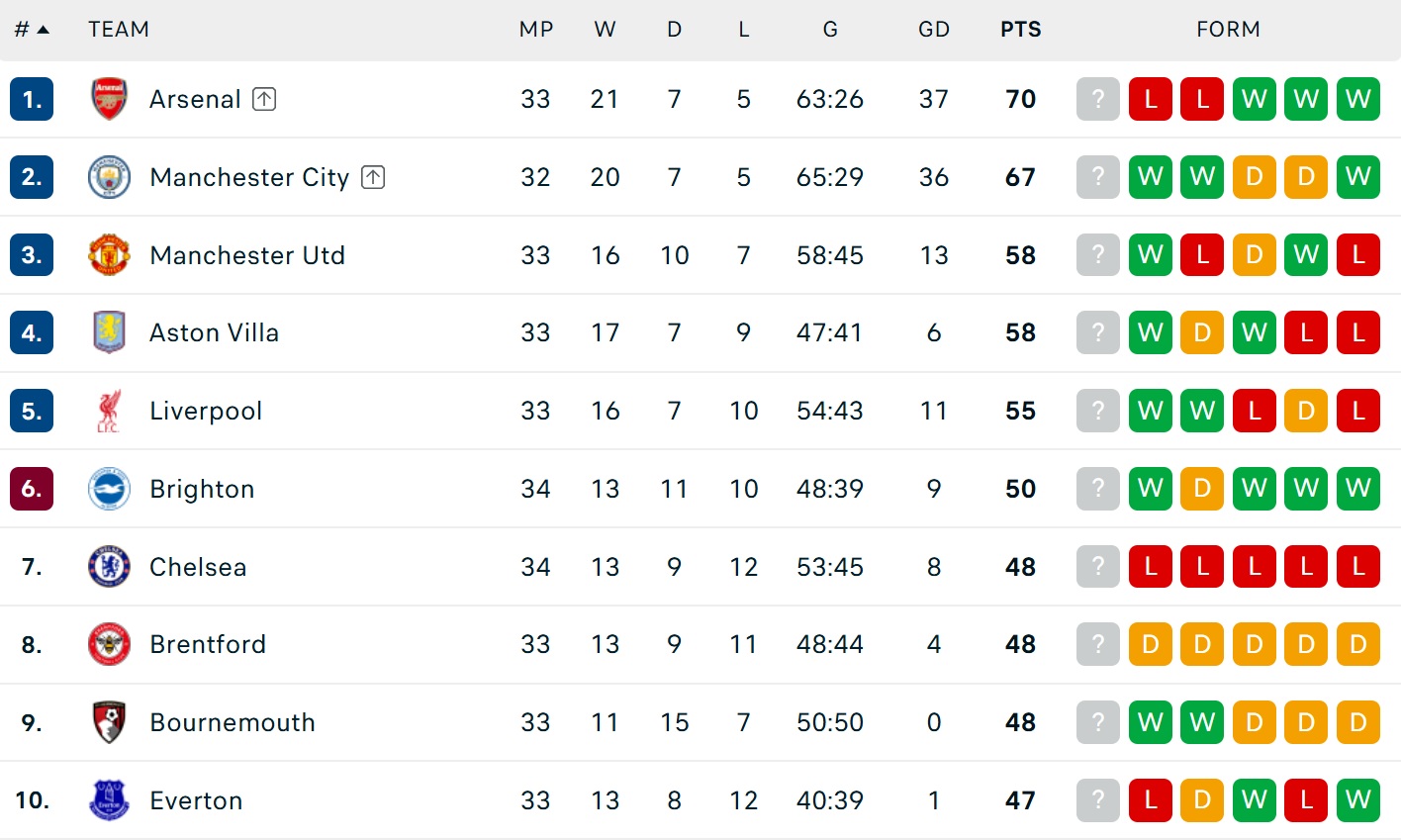 Bảng xếp hạng Ngoại hạng Anh mới nhất