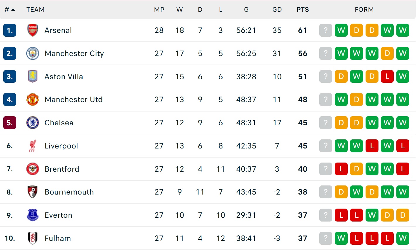 Bảng xếp hạng Ngoại hạng Anh đã chứng kiến sự xáo trộn trong Top 4 sau khi Man Utd đánh bại Everton và vượt qua Chelsea.