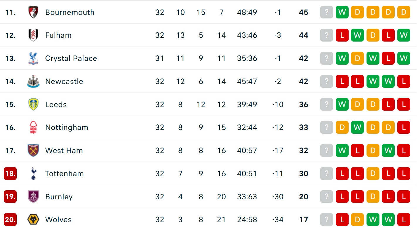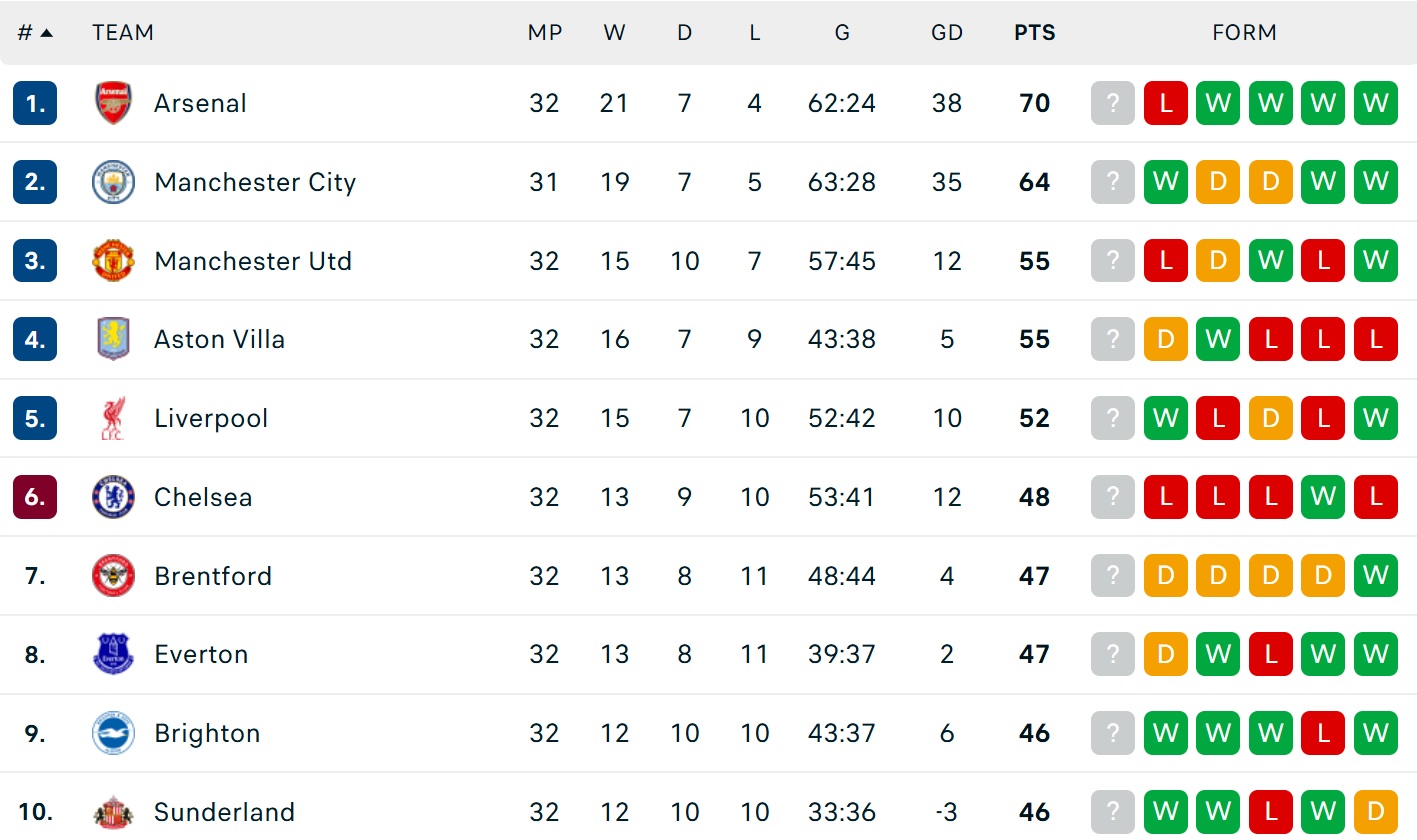 Bảng xếp hạng Ngoại hạng Anh mới nhất