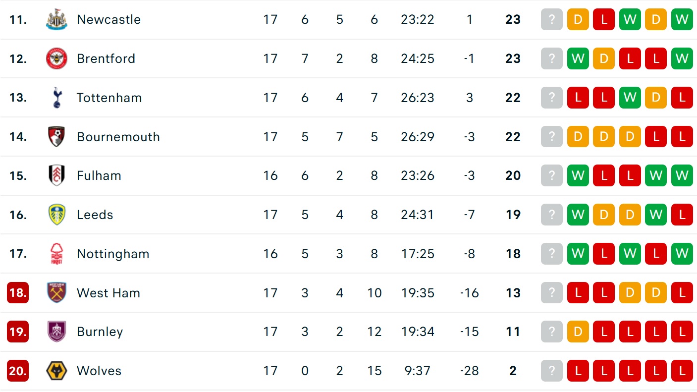 Bảng xếp hạng Ngoại hạng Anh mới nhất