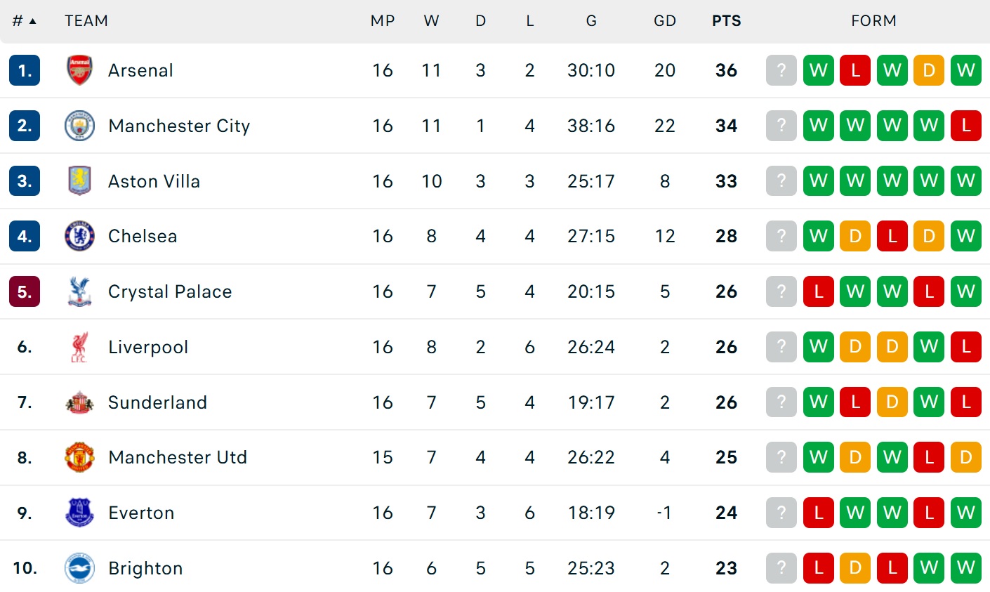 Bảng xếp hạng Ngoại hạng Anh mới nhất