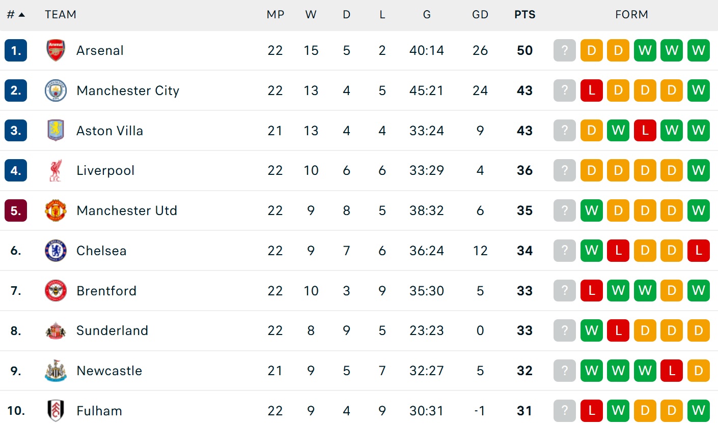 Liverpool cũng gây thất vọng khi để cho đội áp chót Burnley cầm chân 1-1 trên sân nhà. Vì thế, dù đòi lại được vị trí thứ tư từ MU nhưng thầy trò Slot chỉ hơn đối thủ này 1 điểm, hơn Chelsea, Brentford, Sunderland lần luwọt 2 và 3 điểm.