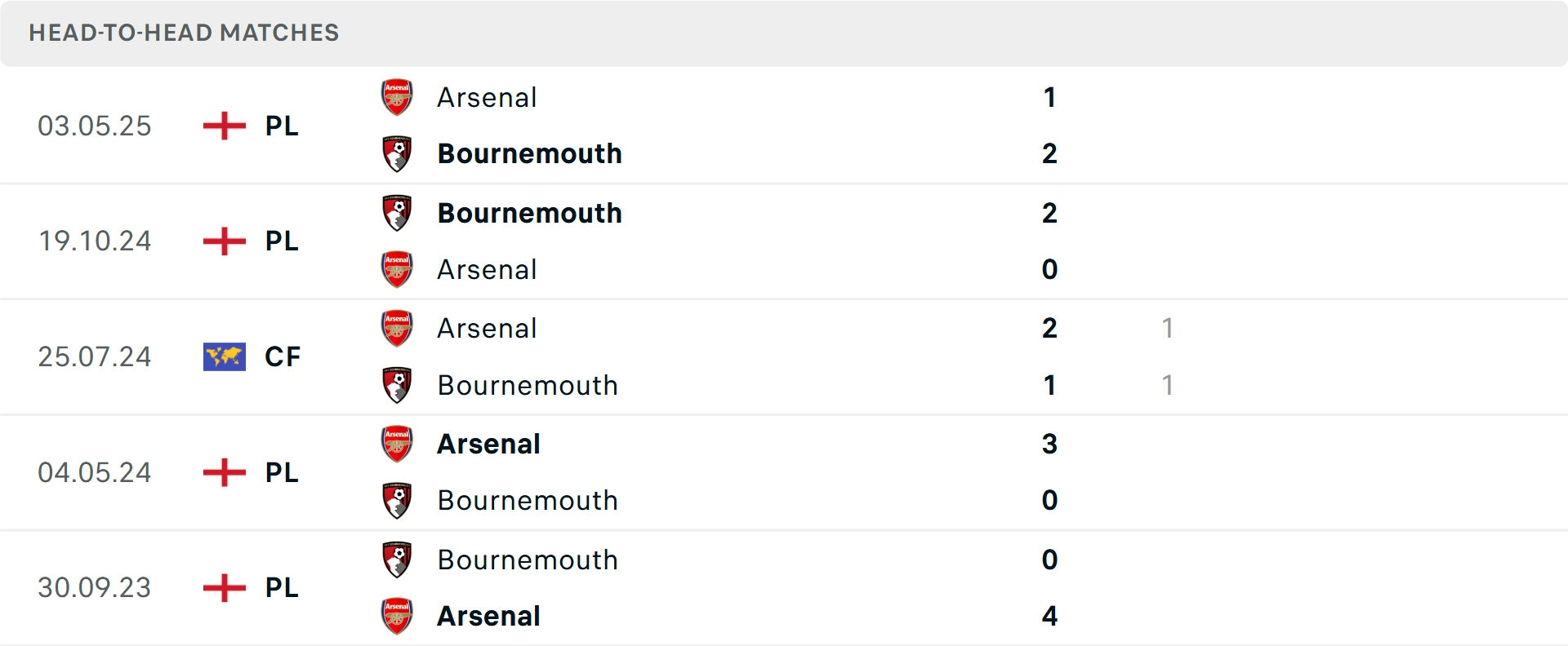 Tỷ lệ trận đấu: Bournemouth thua 7/10 trận gần đây theo tỷ số châu Á. Phía bên kia, Arsenal thắng 2/3 trận mới nhất ở Ngoại hạng Anh.