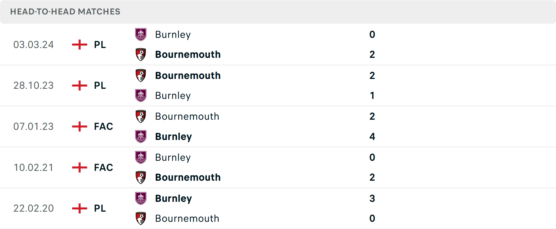 Tổng bàn thắng cả trận: 7/10 trận gần đây của Bournemouth cũng như 7/10 cuộc đối đầu trước đó giữa hai đội vượt mốc tổng bàn thắng. Về phần mình, Burnley lọt lưới 2 bàn trở lên ở 7/8 trận gần đâ