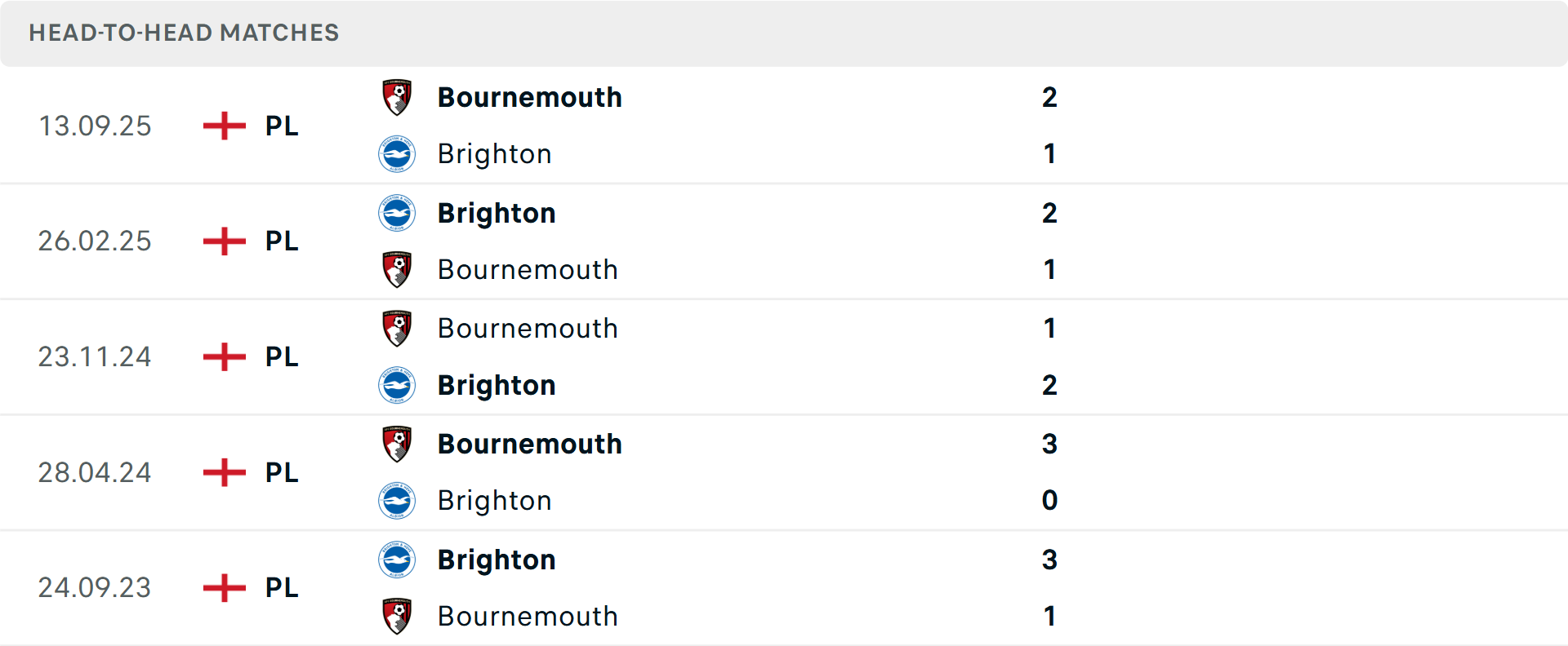 Tổng bàn thắng cả trận: Cả 3 cuộc đối đầu mới nhất giữa hai đội vượt mốc tổng bàn thắng. Brighton ghi 2 bàn ở 3/4 trận vừa qua. Phía bên kia, Bournemouth trải qua 5 trận liên tiếp có từ 4 bàn trở lên.