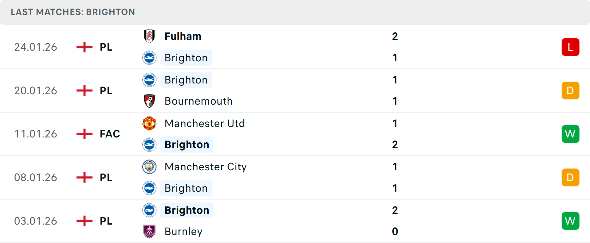 Dù được chơi tại "pháo đài" Amex - nơi Brighton mới chỉ để thua 1 trận mùa này - nhưng phong độ gần đây của thầy trò Fabian Hurzeler lại rất đáng lo ngại khi chỉ thắng 1 trong 10 trận gần nhất. Đặc biệt, Brighton thường xuyên để lọt lưới sớm và đánh rơi điểm số ở những phút cuối.