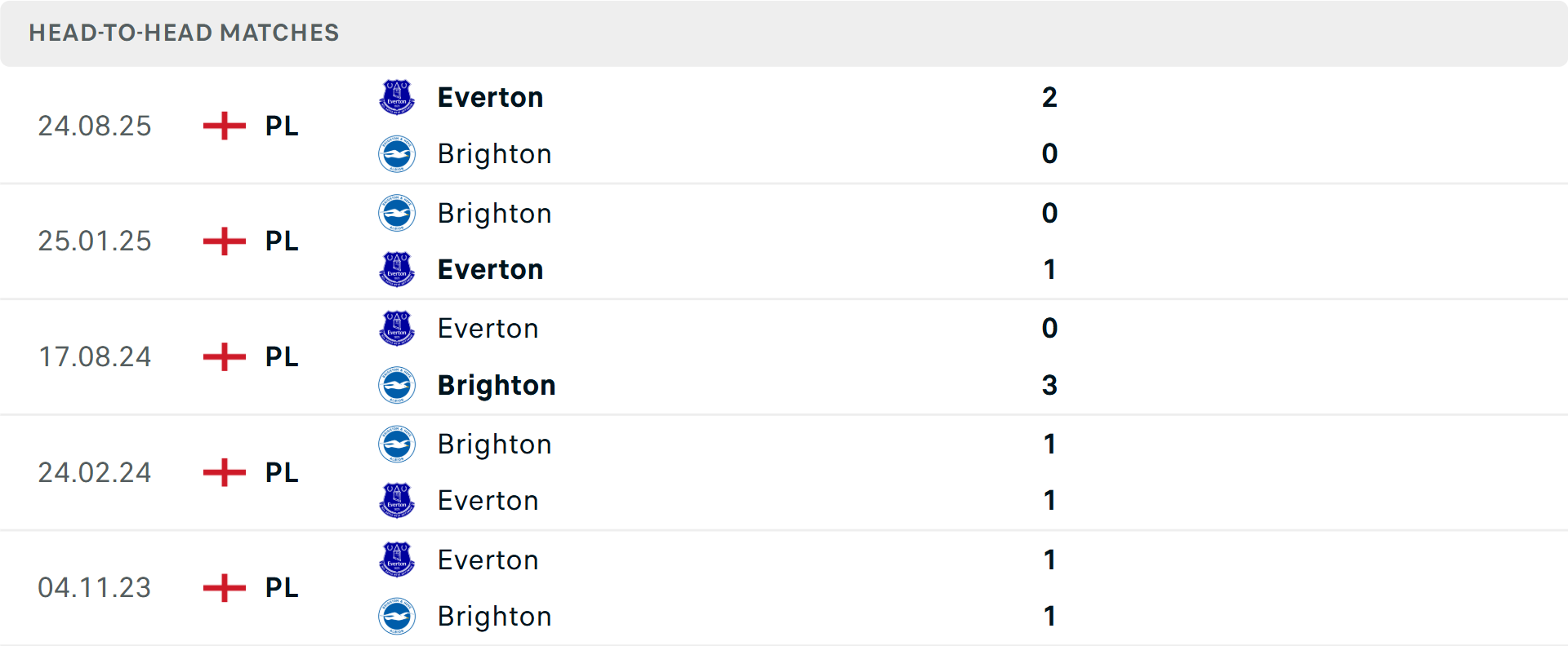 Tổng bàn thắng cả trận: 4/5 cuộc đối đầu mới nhất giữa hai đội dưới mốc tổng bàn thắng, tương tự là 6/10 trận trận gần đây của Brighton và 7/9 trận của Everton.