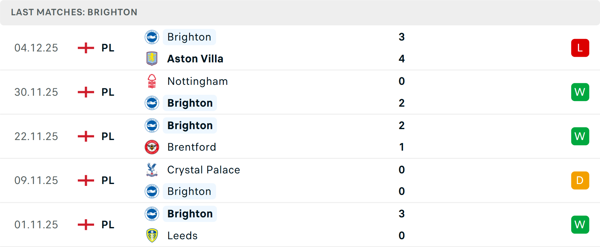 Dù vừa để Aston Villa lội ngược dòng khó tin 4-3, kết thúc chuỗi 4 trận bất bại, hàng công của Brighton dưới thời HLV Fabian Hurzeler vẫn duy trì phong độ hủy diệt tại sân nhà Amex. "Chim mòng biển" đã ghi ít nhất 2 bàn trong 6 trận sân nhà gần nhất ở Ngoại hạng Anh, cho thấy sức mạnh tấn công không thể xem thường. Hiện tại, họ chỉ kém vị trí thứ 4 vỏn vẹn 2 điểm, giấc mơ châu Âu vẫn còn nguyên vẹn.