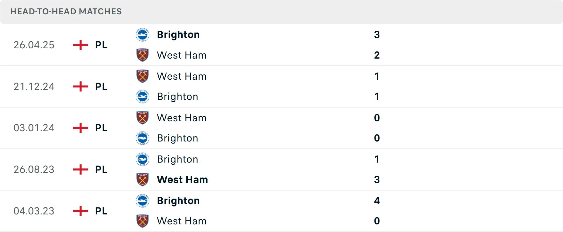 Tỷ lệ trận đấu: Brighton thắng West Ham 7/10 cuộc đối đầu trước đó theo tỷ số châu Á. Brighton cũng thắng 4/5 trận vừa qua. Phía bên kia, West Ham thắng 4/5 trận gần đây.