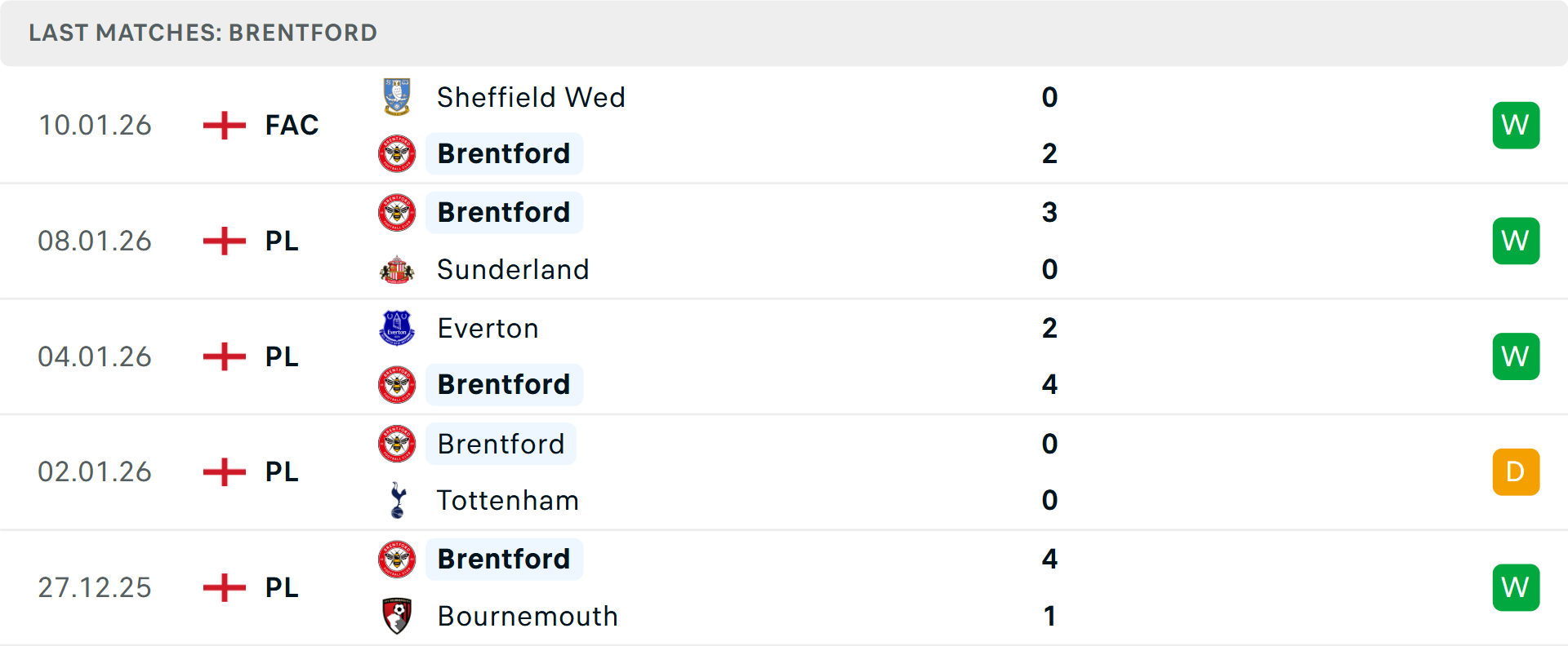 Trong khi đó, Brentford đang bay cao ở vị trí thứ 5 với chuỗi 6 trận bất bại trên mọi đấu trường. Chân sút Igor Thiago đang có phong độ ấn tượng với 5 bàn sau 2 trận gần nhất. Tuy nhiên, "Bầy ong" thường chơi kém thuyết phục trên sân khách với 7 thất bại từ đầu mùa. Với việc 3/4 cuộc đối đầu gần nhất giữa hai đội kết thúc với tỷ số hòa, kịch bản chia điểm trong một trận cầu rượt đuổi dễ xảy ra.