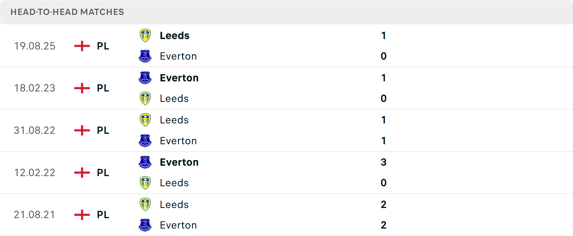 Tổng bàn thắng cả trận: Cả 3 cuộc đối đầu mới nhất giữa hai đội đều dưới mốc tổng bàn thắng, tương tự là 8/10 trận gần đây của Everton và 4/6 trận của Leeds.