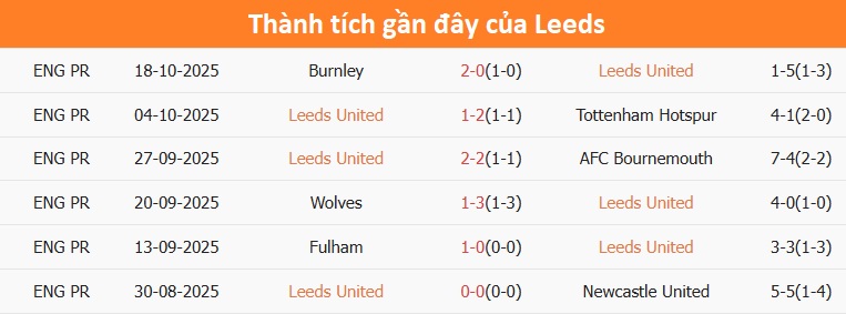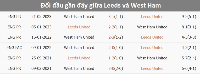 Tỷ lệ trận đấu: Leeds thắng West Ham 2/3 cuộc đối đầu mới nhất theo tỷ số châu Á. Leeds thua 2 trận vừa qua, trong khi West Ham thua 8/10 trận gần đây.