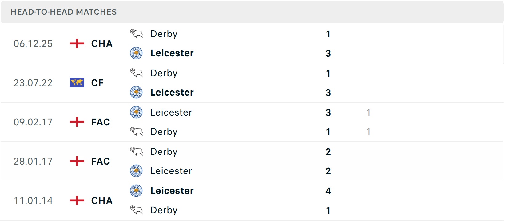 Tỷ lệ trận đấu: Leicester chỉ thắng 2/7 trận gần đây theo tỷ số châu Á, gồm thua 2 trận mới nhất. Về phần mình, Derby thắng 2/3 trận vừa qua.
