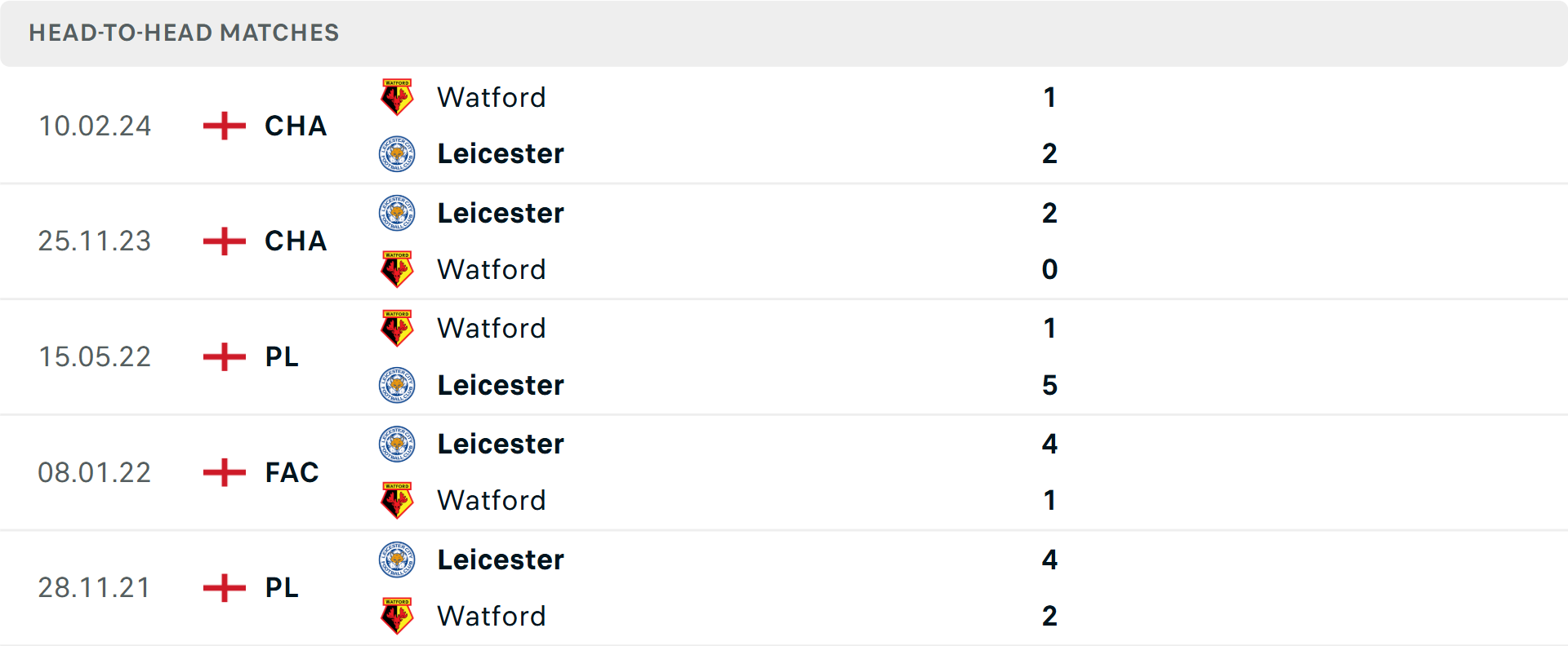 Lịch sử cũng ủng hộ chủ nhà khi 5 trong số 6 trận thua của Watford mùa này chỉ có cách biệt 1 bàn. Một chiến thắng tối thiểu sẽ giúp Leicester vượt mặt chính đối thủ trên bảng tổng sắp.