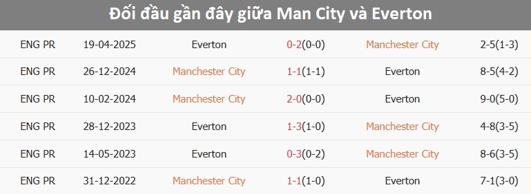 Tỷ lệ trận đấu: Man City thắng Everton 4/5 cuộc đối đầu mới nhất theo tỷ số châu Á. Man City cũng thắng 5/7 trận gần đây. Về phần mình, Everton thua 2/3 trận mới nhất.
