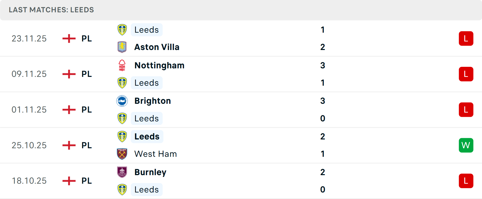 Về phía Leeds, họ đang gặp khó khăn khi thua 5 trong 6 trận gần nhất và rơi vào nhóm xuống hạng. Hàng thủ của HLV Daniel Farke đã thủng lưới trong 9 trận liên tiếp (tổng cộng 17 bàn). Leeds có xu hướng ghi bàn sớm, nhưng tổng số bàn thắng của họ (11 bàn) thuộc hàng thấp nhất giải.