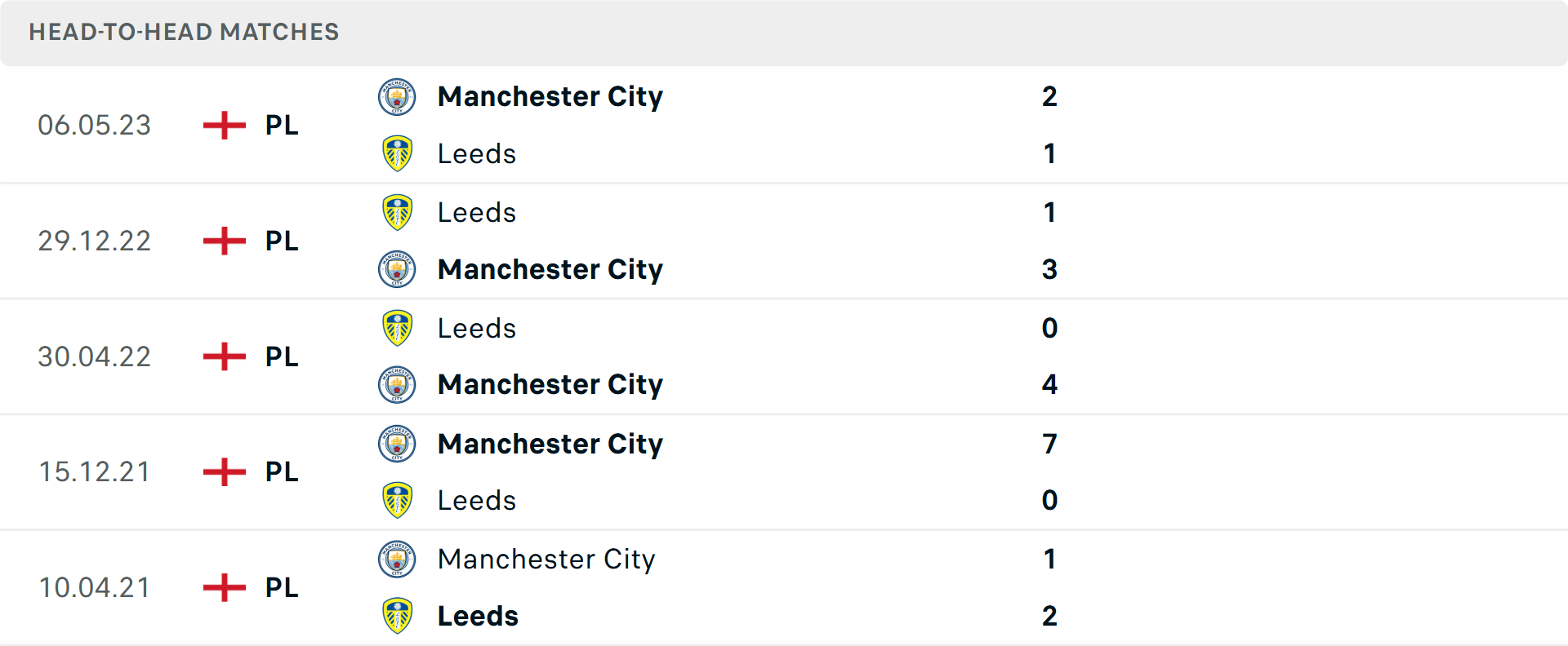 Tổng bàn thắng cả trận: 3/4 cuộc đối đầu mới nhất giữa hai đội vượt mốc tổng bàn thắng, tương tự là 4/6 trận gần đây của Man City và 7/8 trận của Leeds.