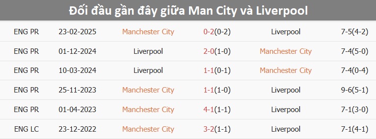 Tỷ lệ trận đấu: Man City thắng 6/7 trận gần đây theo tỷ số châu Á, trên sân nhà là cả 6 trận mới nhất. Về phần mình, Liverpool thắng 2 trận vừa qua nhưng thua 8/9 trận trước đó.