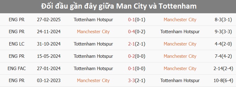 Tỷ lệ trận đấu: Man City thắng Tottenham 3/5 cuộc đối đầu mới nhất theo tỷ số châu Á. Man City cũng thắng 4/5 trận gần đây. Về phần mình, Tottenham toàn thắng 2 trận vừa qua.