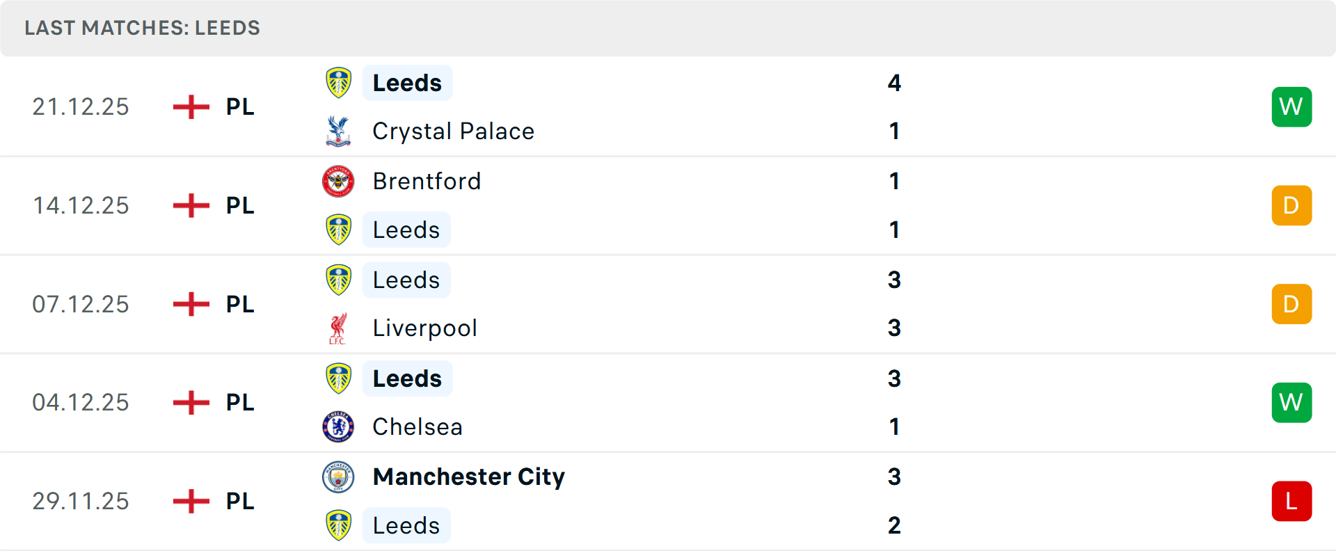 Ngược lại, Leeds dù đang có tâm lý hưng phấn sau trận thắng Crystal Palace 4-1, nhưng họ lại thường xuyên "khôn nhà dại chợ". Đội bóng của Daniel Farke đã thua tới 6 trong 8 chuyến làm khách và chỉ thắng duy nhất Wolves ở đáy bảng. Việc thiếu vắng các trụ cột như Daniel James hay Sean Longstaff càng khiến Leeds thêm khó khăn.