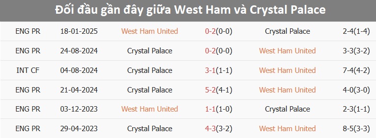 Tỷ lệ trận đấu: West Ham thua 5/6 trận gần đây theo tỷ số châu Á cũng như thua 6/7 cuộc đối đầu trước đó. Về phần mình, Crystal Palace cũng thua 5/6 trận mới nhất.