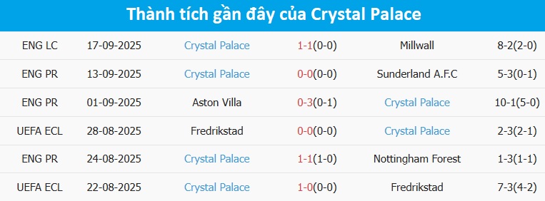 Ngược lại, Palace vẫn duy trì thành tích bất bại. Có điều, họ chỉ thắng một trong 4 trận đấu ở Ngoại hạng Anh và đang gặp khó khăn trong việc ghi bàn một cách ổn định. Tuy nhiên, việc West Ham để thua 8 bàn trong hai trận sân nhà cho đến nay sẽ tạo cơ hội hoàn hảo cho Palace ghi bàn trở lại, nhờ đó có thể giành chiến thắng với cách biệt sít sao.