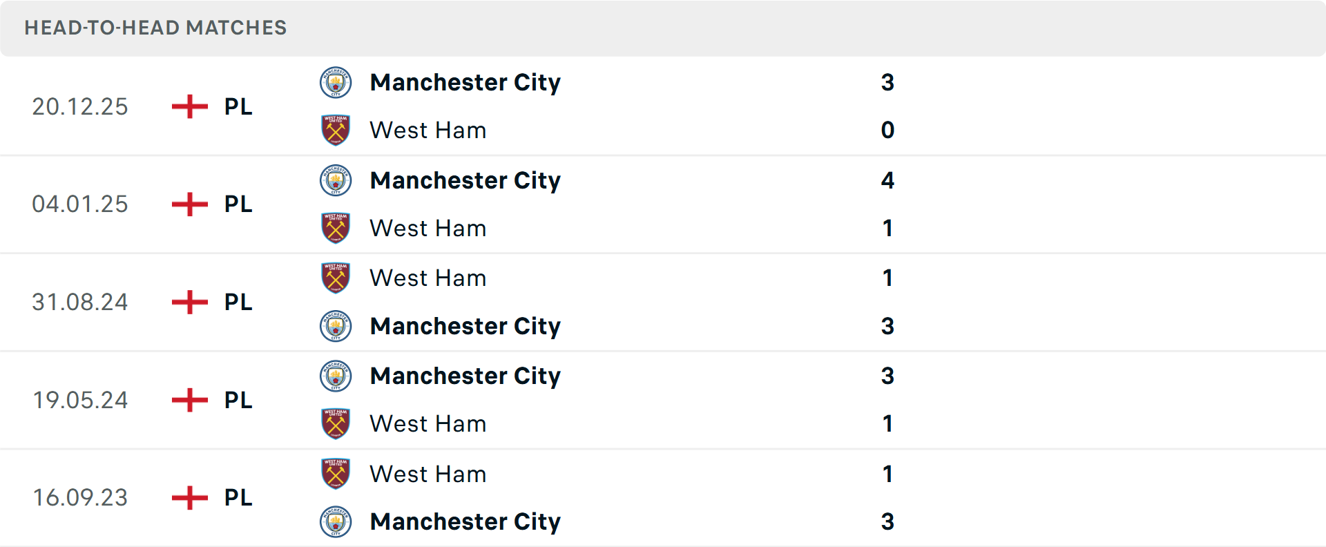 Tổng bàn thắng cả trận: Cả 6 cuộc đối đầu trước đó giữa hai đội đều có từ 3 bàn trở lên. 2/3 trận vừa qua của cả West Ham Man City vượt mốc tổng bàn thắng.
