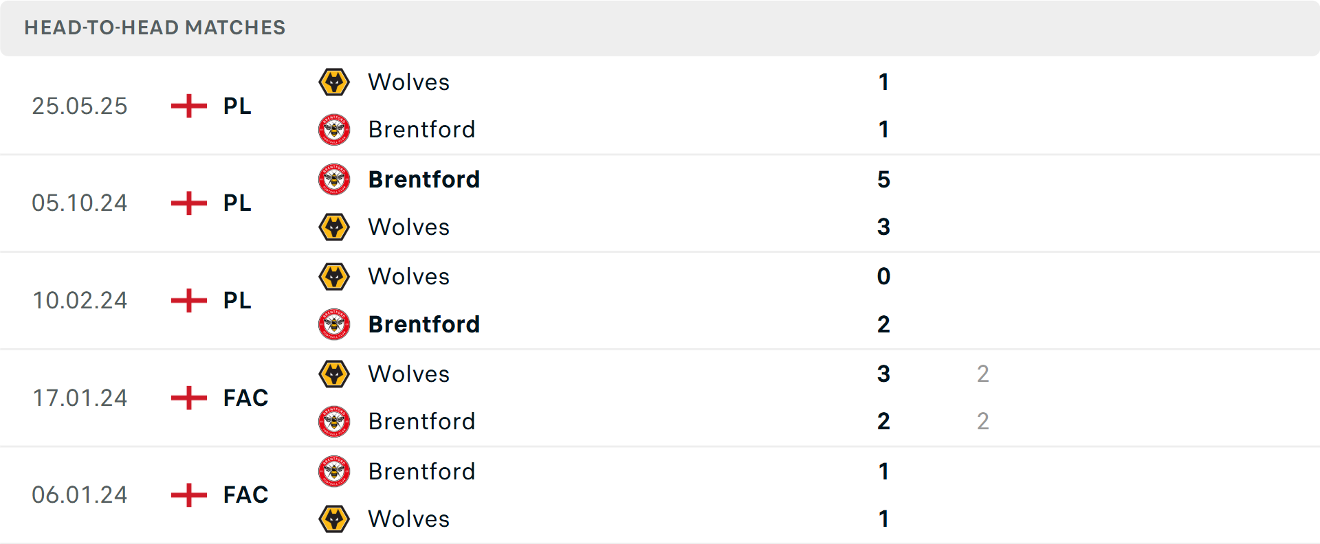 Lịch sử đối đầu cũng ủng hộ đội khách khi Wolves không thắng trong 5 lần chạm trán gần nhất. Dù Brentford thường chơi không tốt trên sân khách, nhưng trước một Wolves đang rệu rã và mất phương hướng, "Bầy ong" hoàn toàn có thể ra về với trọn vẹn 3 điểm nhờ sự sắc bén của hàng công.