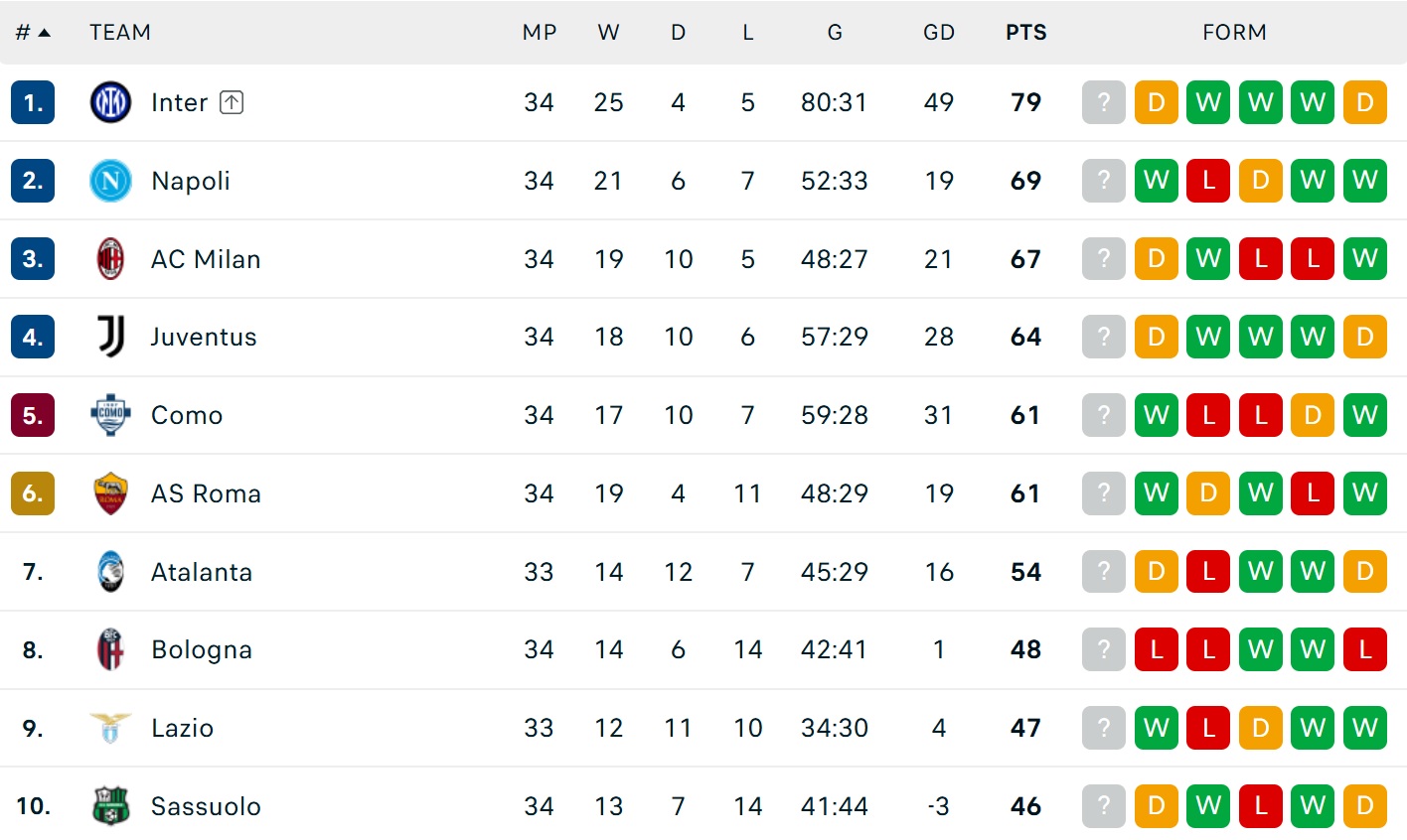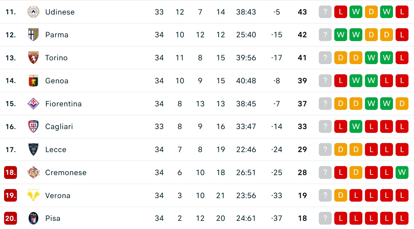 Việc AC Milan và Juventus ghìm chân nhau bằng trận hoà 0-0 khiến cơ hội mở ra cho các đối thủ phía sau, gồm Como và AS Roma. Trước 4 vòng cuối cùng,