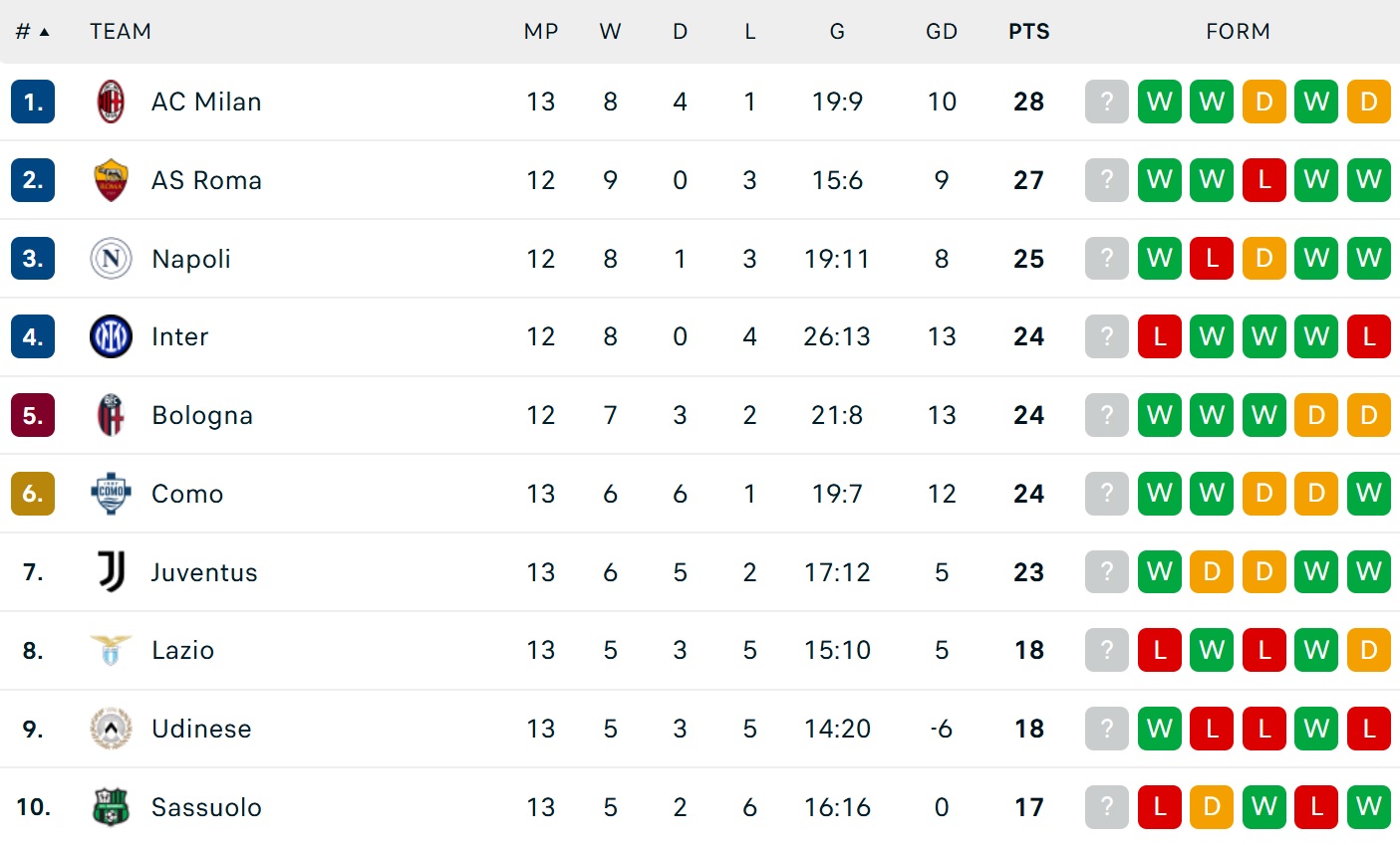 AC Milan đã giành chiến thắng tối thiểu 1-0 trước Lazio trong trận đấu sớm vòng 13 Serie A, qua đó độc chiếm ngôi đầu bảng xếp hạng ít nhất trong vòng một đêm.
