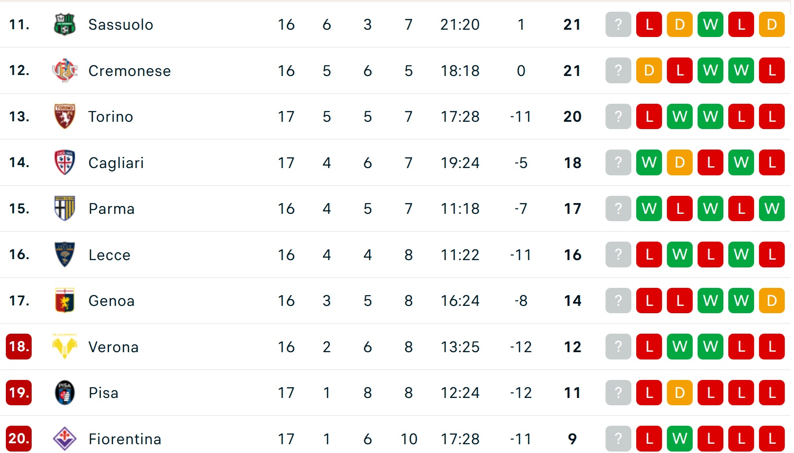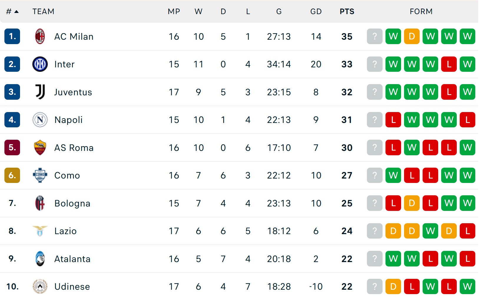 Bảng xếp hạng Serie A mới nhất