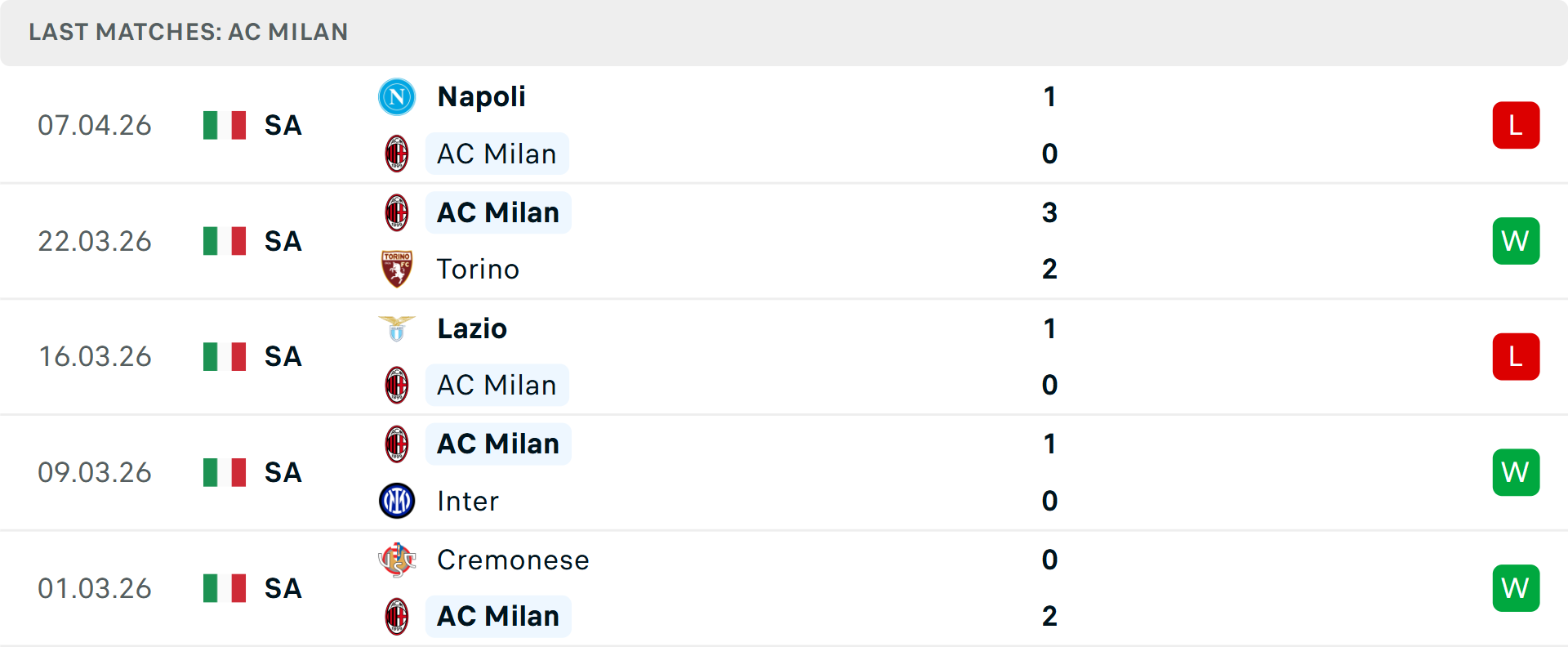 Thất bại tối thiểu trước Napoli khiến hy vọng vô địch của AC Milan gần như tan biến khi khoảng cách với ngôi đầu đã là 9 điểm. Hiện tại, mục tiêu thực thiết thực nhất của thầy trò HLV Max Allegri là bảo vệ tấm vé dự Champions League trước sự bám đuổi gắt gao từ Como hay Juventus.